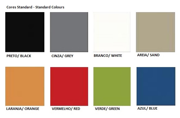 Cores Disponíveis PP: Preto/ Cinza/ Branco/ Areia/ Laranja/ Vermelho/ Verde/ Azul