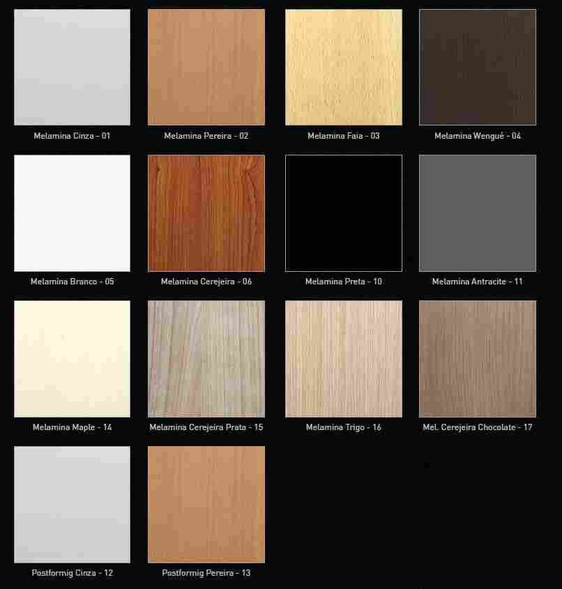 Melamina: Cinza, Pereira, Faia, Wengué, Branco, Cerejeira, Preto ou Antracite.