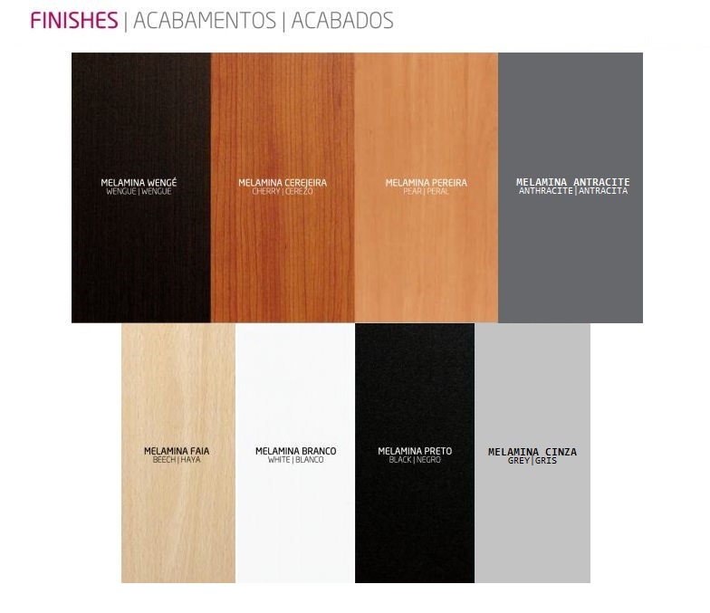 Melamina Cinza, Pereira, Faia, Wengué, Branco, Cerejeira, Preto ou Antracite.